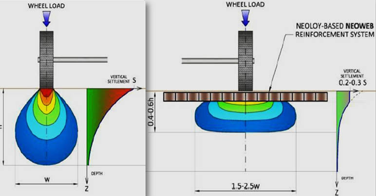 지오타이(Geotie)소개 연약지반보강에 사용되는 토목섬유의 하나인 지오타이는 3차원 형태로 제작된 토목섬유의 단위 셀(Cell)안에 조립토를 채워 보강하는 시스템으로 종래의 지반보강을 위해 사용되는 지오그리드(지오텍스타일)에서 한 단계 더 진전된 것으로서 삼차원 형태로 제작된 복합재를 이용하여 지반의 강도 및 지지력을 증가시키며, 침하량을 감소시키는 공법이다. 중차량 재하 무보강 / 지오타이 보강