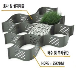 지오타이 특징 Geotie 3D 식생벽체 토사가 격벽에 의하여 구속되면 마치 격벽이 토체의 주변을 둘러싸고 있는 벽체의 형태로 작용하며, 주변 셀에서도 이에 대응하는 수평응력으로 격벽을 밀어 내고 있기 때문에 격벽은 중립의 위치에 있게 되어 자립성을 유지하며 셀에 채워진 흙은 마치 슬래브 형태로 작용하여 하중분산 효과를 얻을 수 있으며, 수직방향의 변위를 구속하고 일반적인 지반파괴개념을 개선한다. 우기시 집중호우에 의한 배수체계