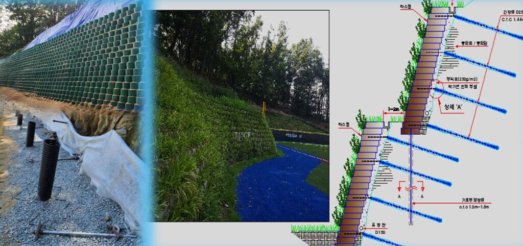 그 외 옹벽의 높이가 높을 경우 전면벽체인 지오타이와 수직기둥을 활용하여 보강 자립식옹벽을 7m 이상에도 적용할 수 있다.