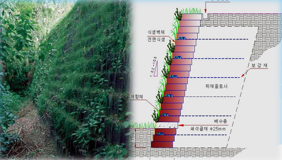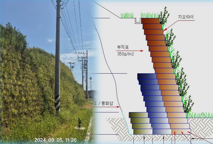 지오타이 옹벽은 지오그리드와 띠형섬유보강재 및 철근과