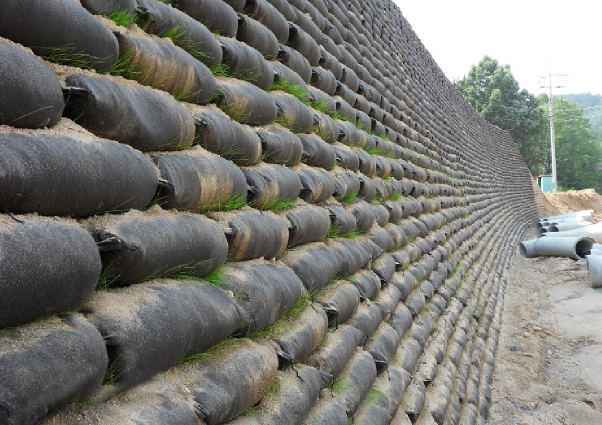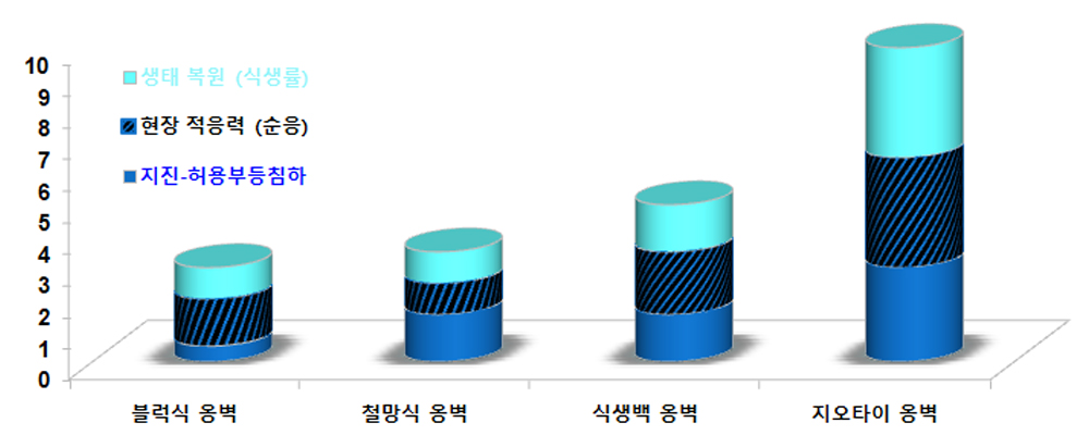 지오타이 옹벽 전면벽체의 주재료는 토체로써 그 두께는 90cm이상을 확보하는 토심을 보유하여 “생태적 기능 및 자연순환기능이 있는 토양면적으로써 환경의 자정능력이 있다.